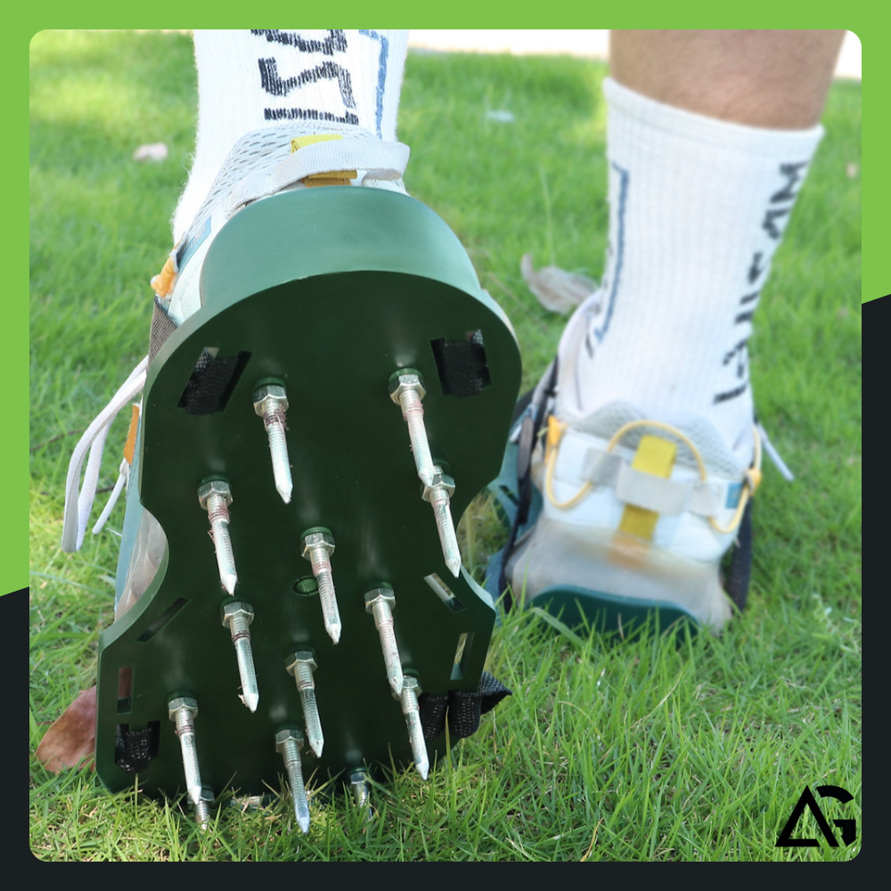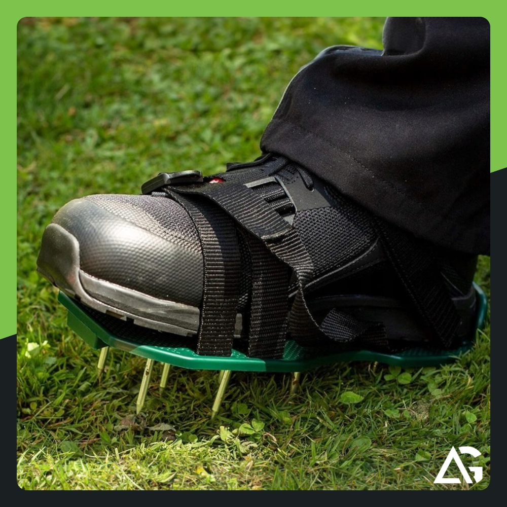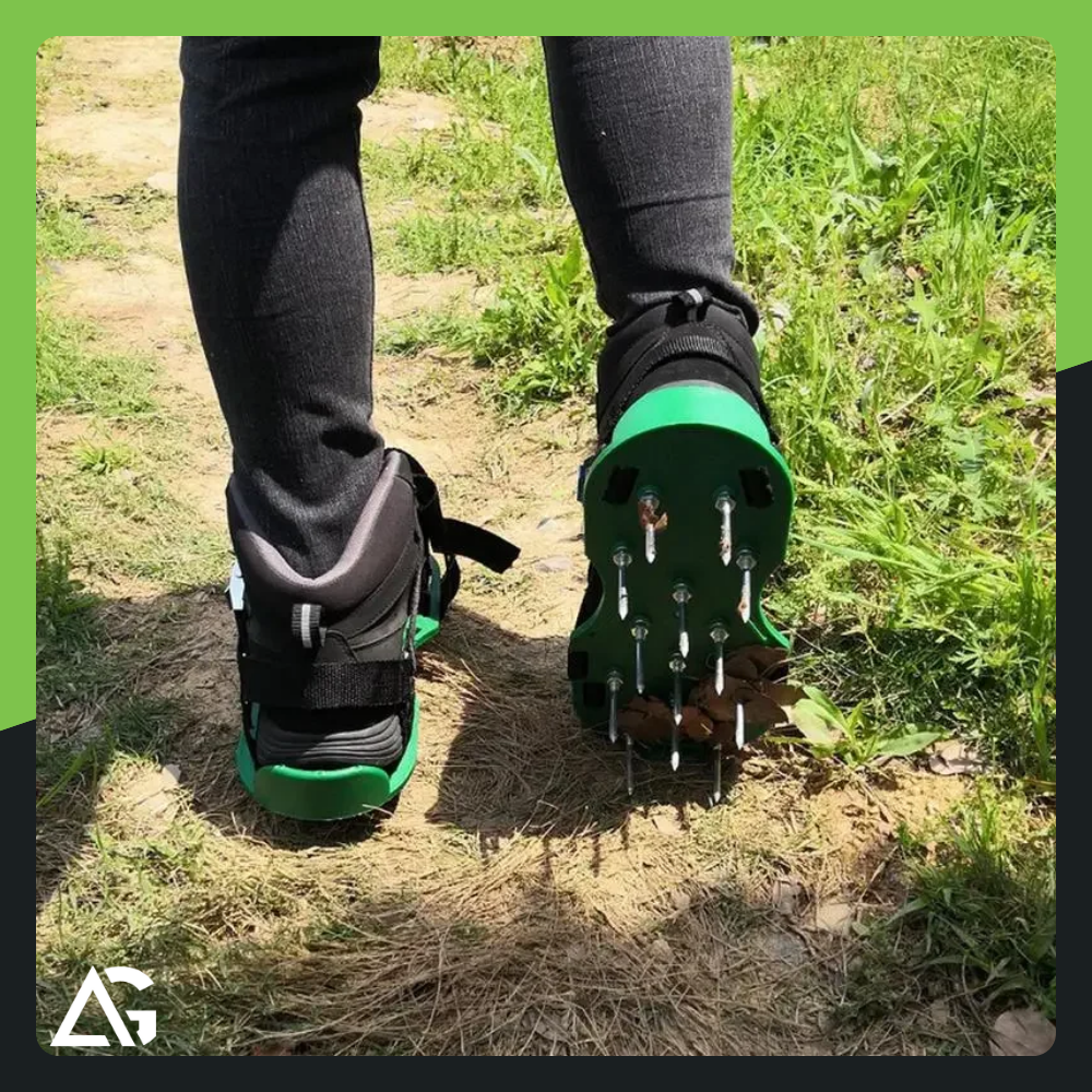 Aerator do trawnika w formie nakładek na buty pozwala łatwo napowietrzyć glebę podczas chodzenia.