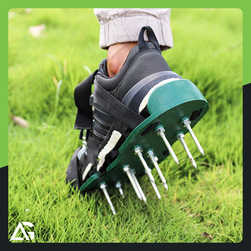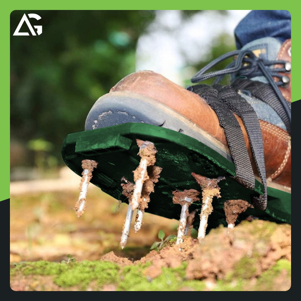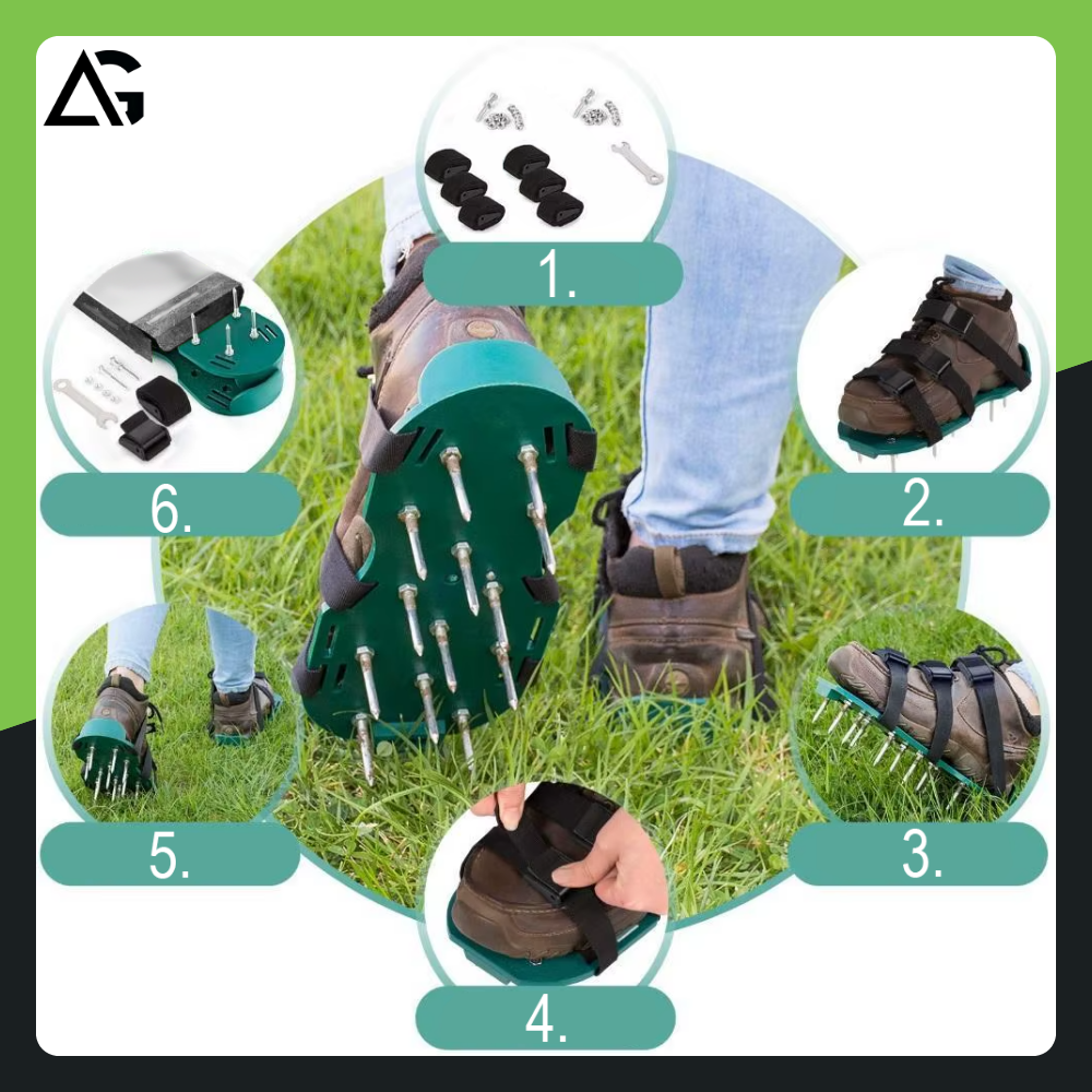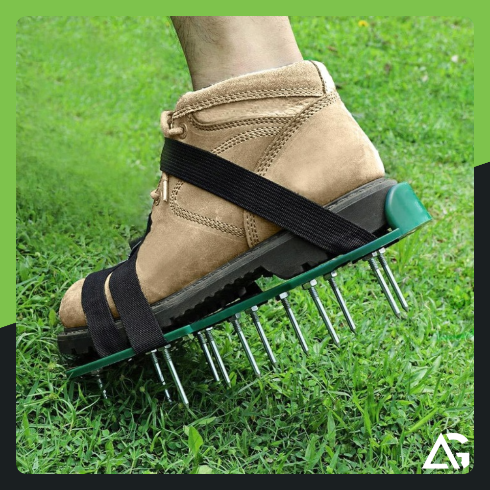 Aerator do trawnika w formie nakładek na buty pozwala łatwo napowietrzyć glebę podczas chodzenia.